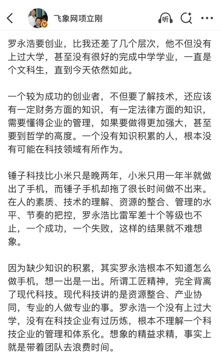 项立刚称罗永浩要创业,比我还差了几个档次,他不但莫得上过大学,以致莫得很好的完成中学学业,一直是个文科生,直到今天仍是如斯。