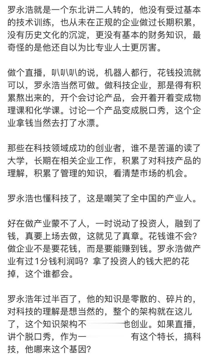 “罗永浩年过半百了,他的学问是零碎的、碎屑的,对科技的意会是思固然的,统统这个词的架构就在这儿了,这个学问架构不及以撑捏他创业。淌若直播,讲个脱口秀,他算作一个东北东说念主,有这个特长。要搞科技,他哪来这个基因?”